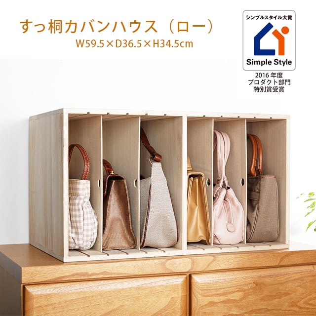 すっきりとした桐の風合いが魅力のカバンハウス「ロー」。木製のカバン収納ケースです。